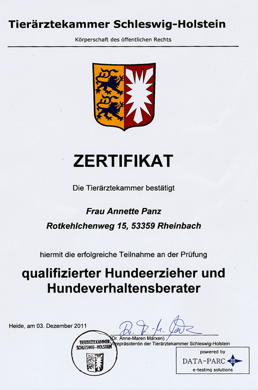 Die Zertifizierung hilft Hundehaltern, Behörden, Züchtern, und anderen Institutionen anhand von objektiven Kriterien eine qualifizierte Hundeschule zu finden. Die Daten des/der Zertifikatsinhabers/-inhaberin werden auf der Homepage der Tierärztekammer Schleswig-Holstein veröffentlicht und an Behörden und Gemeinden weitergegeben. |